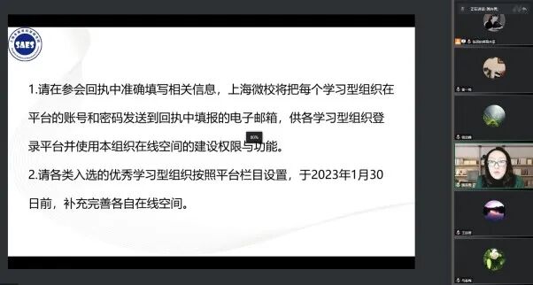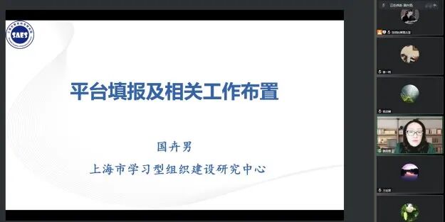 上海市学习型组织建设研究中心国卉男对平台填报及相关工作进行了布置。一是回执的填报,后台将根据相关信息发送各组织的账号与密码;二是完善在线空间及相关资料的填报与提交,各类入选的优秀学习型组织按照平台栏目设置进一步补充完善在线空间,并提交相关案例照片;三是管理群的建设,后期将在群内发送平台操作手册与指导视频及进行相关工作交流等。